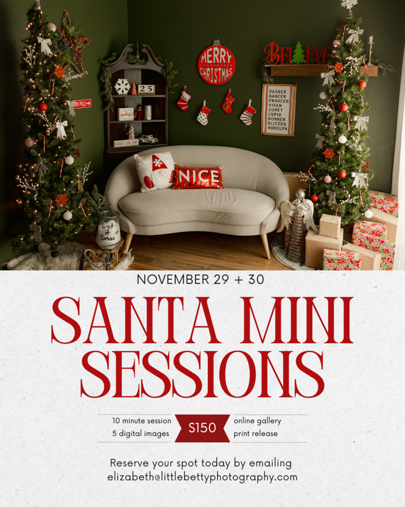 Your Santa session includes a 10-minute visit with the big guy, 5 beautifully edited digital images, and all the cozy holiday joy you can handle.